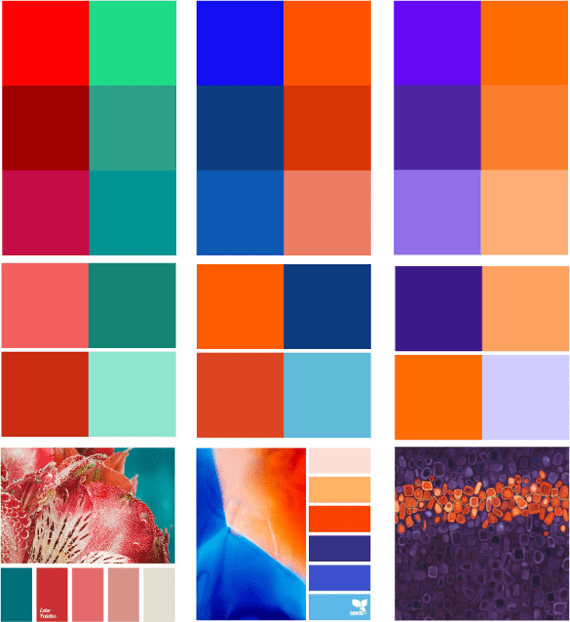 Dve komplementarne boje su u načelu suprotne i stoje u krugu boja jedna nasuprot drugoj. Suprotne su ali idealno odgovaraju jedna drugoj. Nalazeći se jedna pokraj druge, međusobno pojačavaju vlastiti učinak, dok se miješanjem potpuno neutraliziraju.